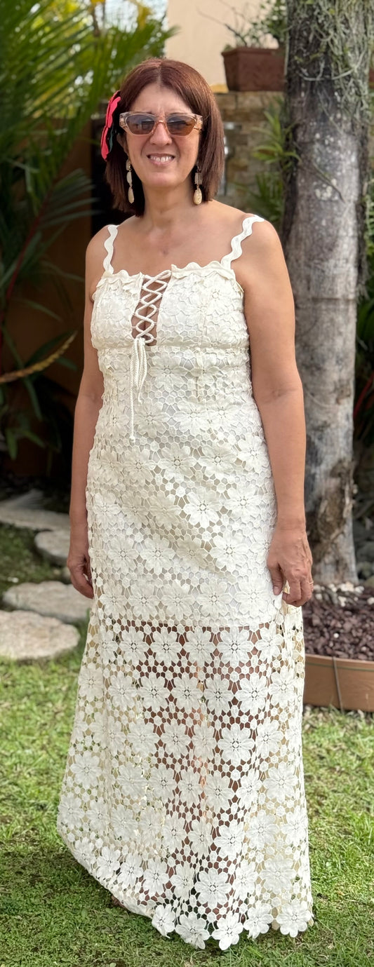 Vestido Midi Blanco con Tirantes y Cintas Negras