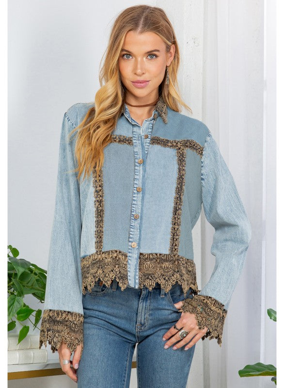 Canaliza tu diosa genial interior con esta chaqueta de mezclilla de inspiración retro, donde los azules fríos se encuentran con encaje de grava teñido a mano para un giro cautivador en un clásico.