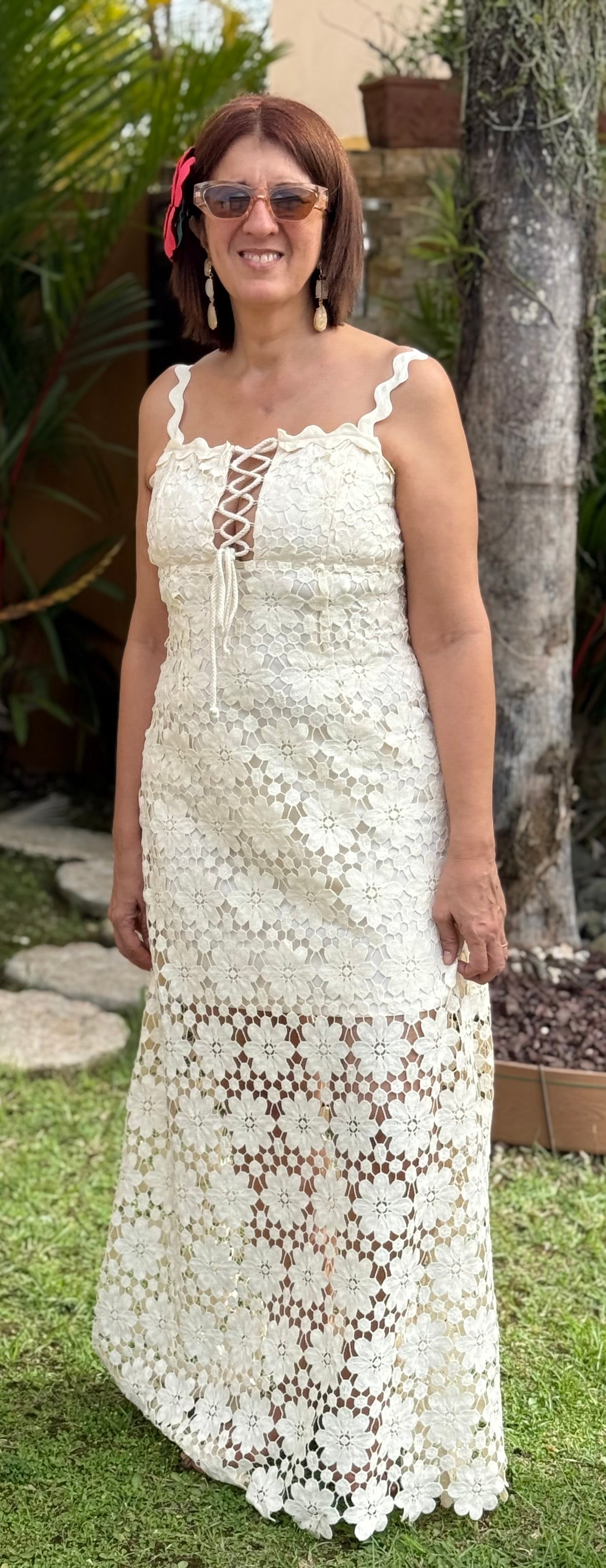 Este vestido sin mangas presenta tirantes ajustables y un corpiño estilo corsé con un lazo delantero para un ajuste personalizado.La tela de color natural está adornada con un delicado encaje de crochet que fluye hasta el largo máximo mientras que el forro se detiene a la mitad del largo del vestido, lo que permite que el encaje se vea a través de la parte inferior del vestido. Una cremallera en la espalda asegura un uso fácil.