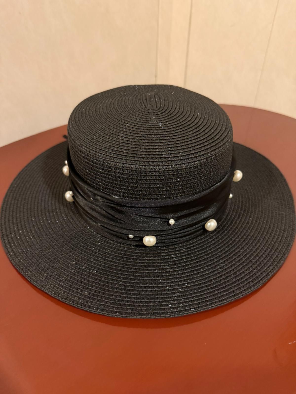 Mas que un accesorio es una expresión de identidad y estilo. Esta pamela jaspeada en su alrededor con una cinta con perlas.