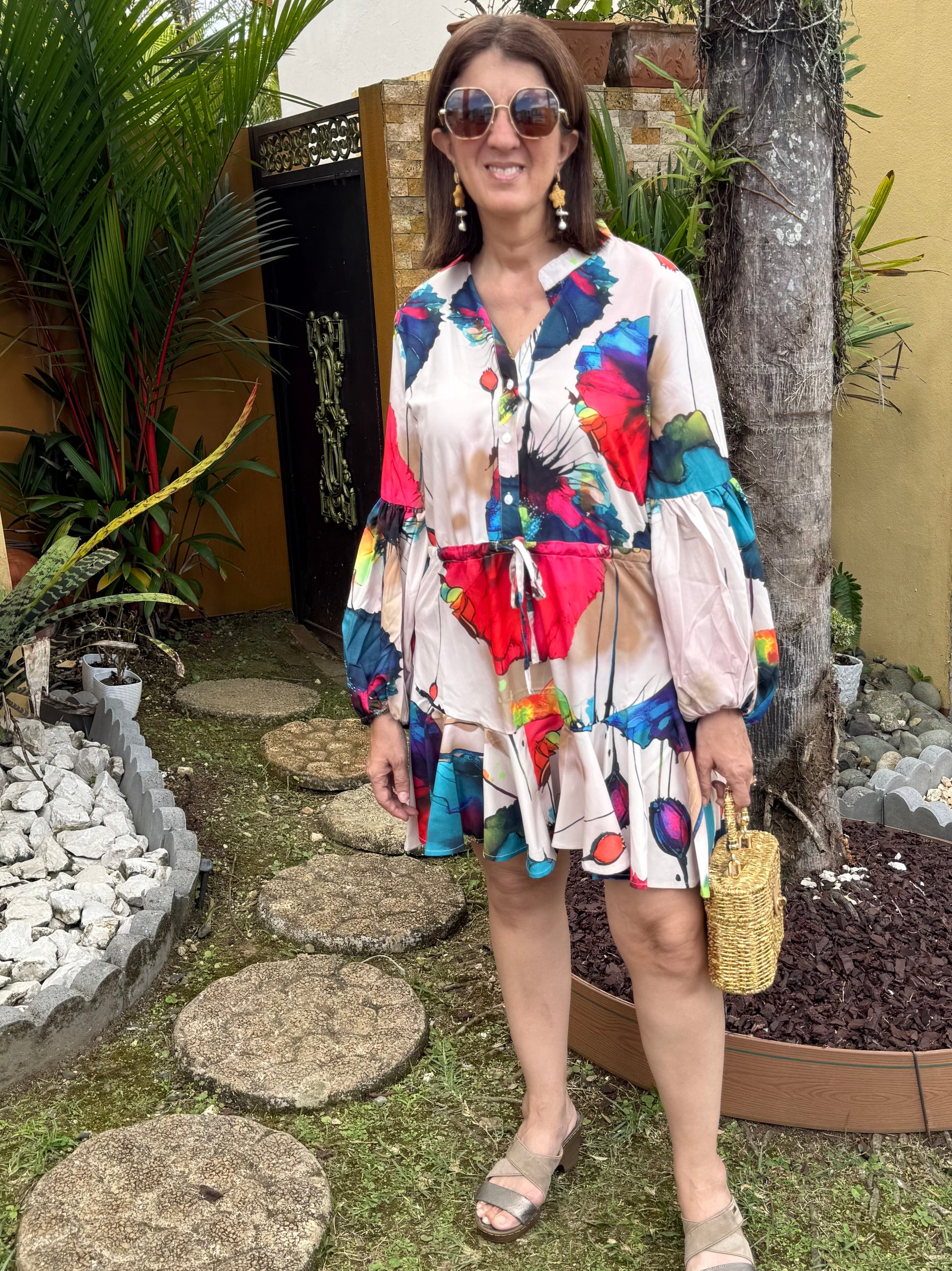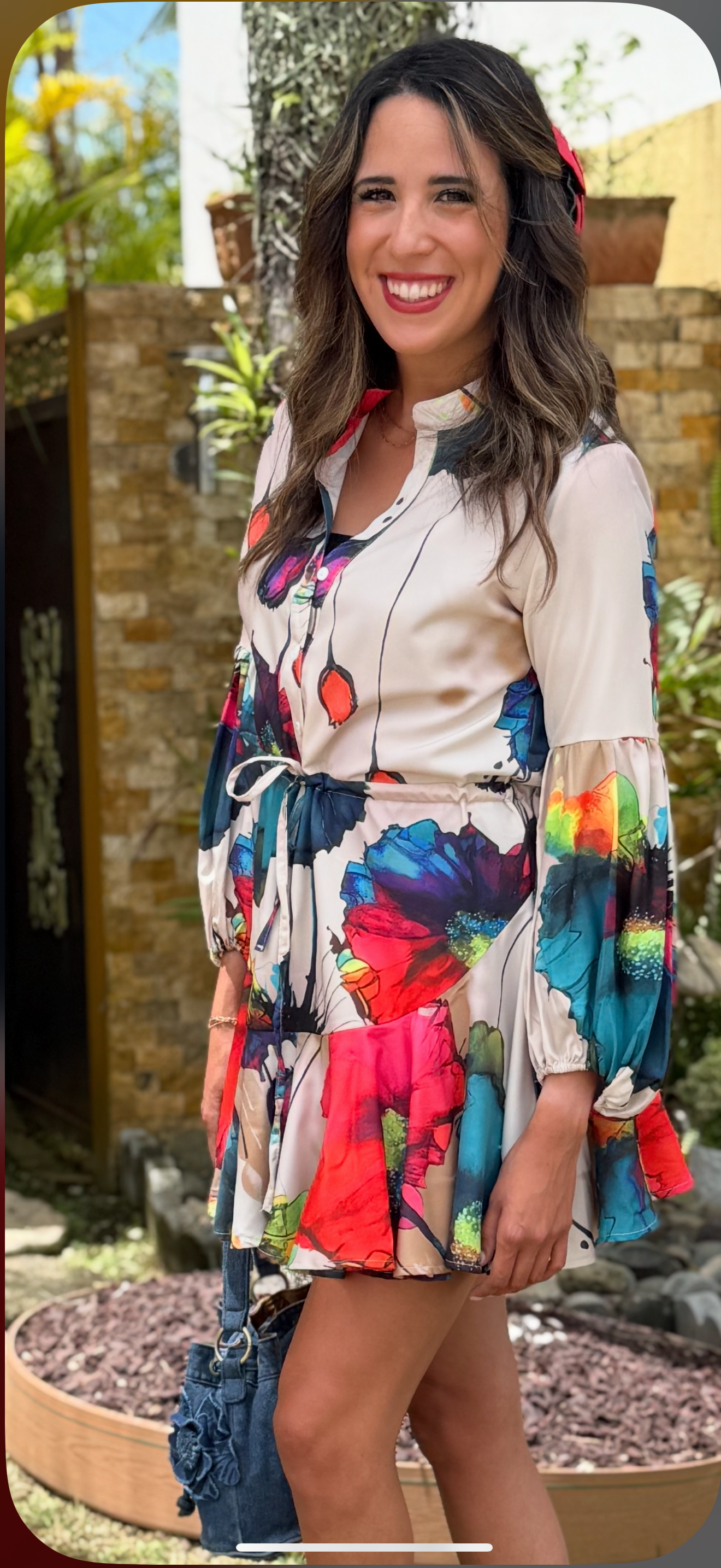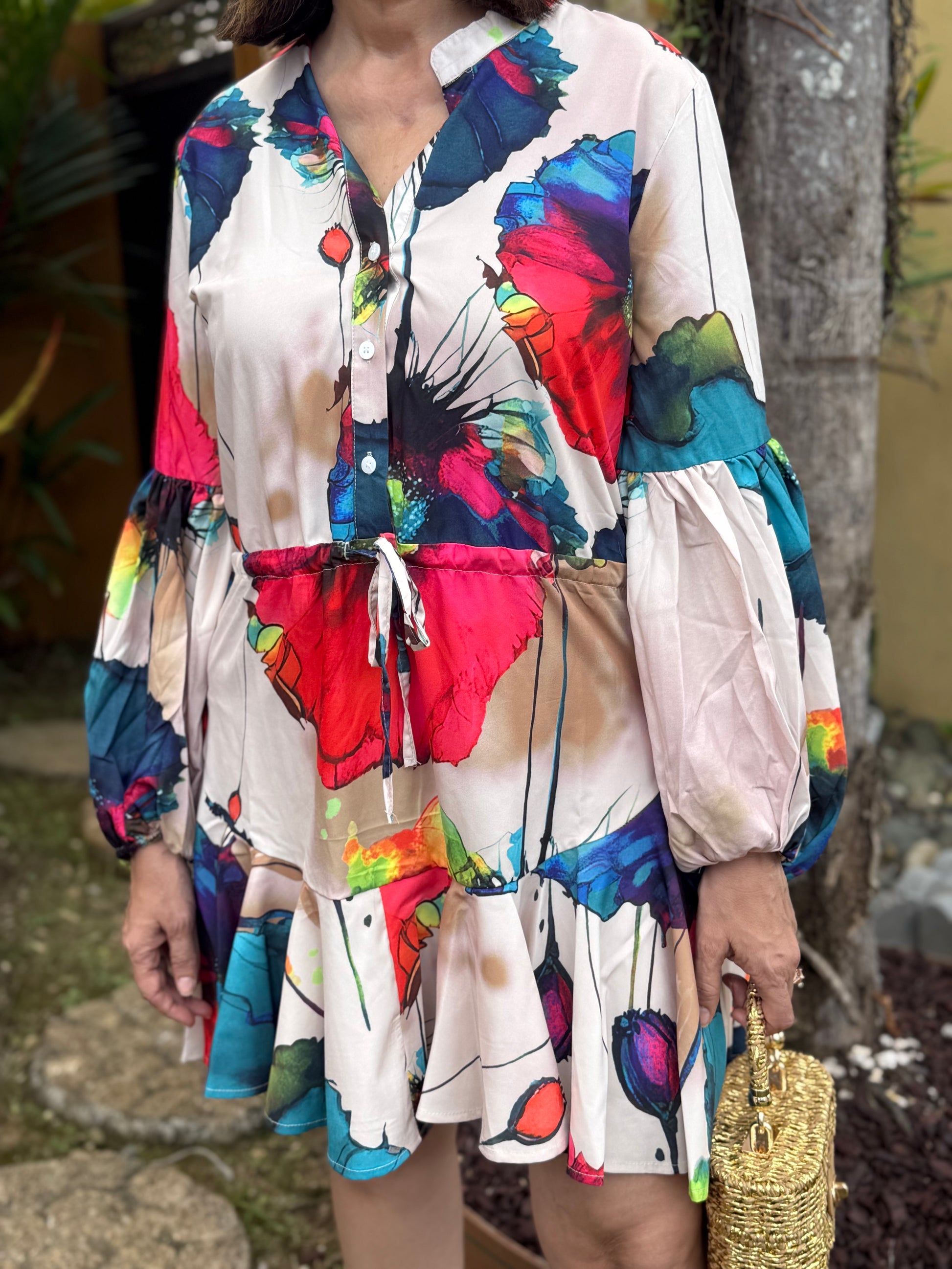 Minifalda con estampado floral, escote abierto, mangas largas con elásticos, cinturilla con cordón, cierre de botones delanteros.